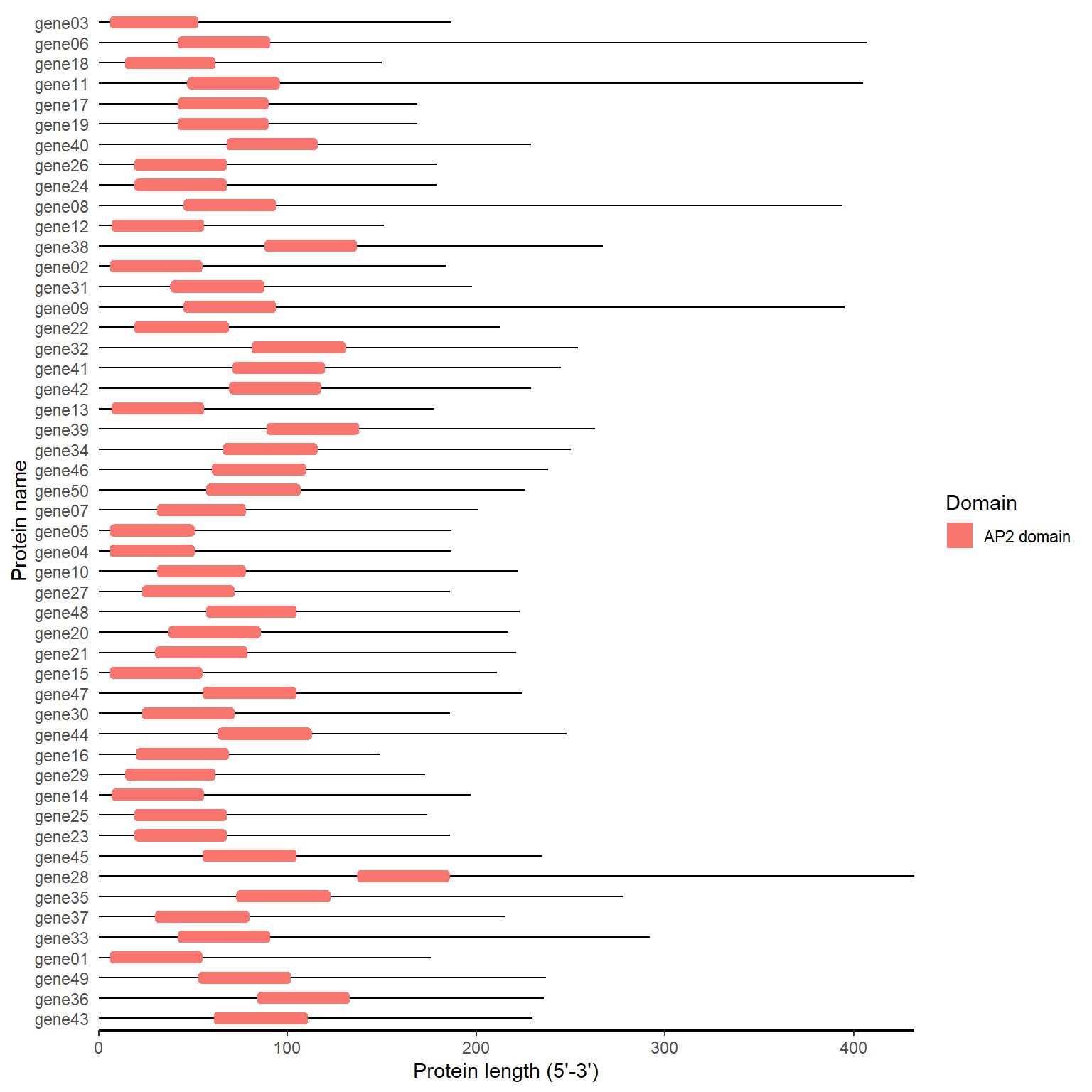 labs(x="DNA length (5'-3')", y="Gene name")