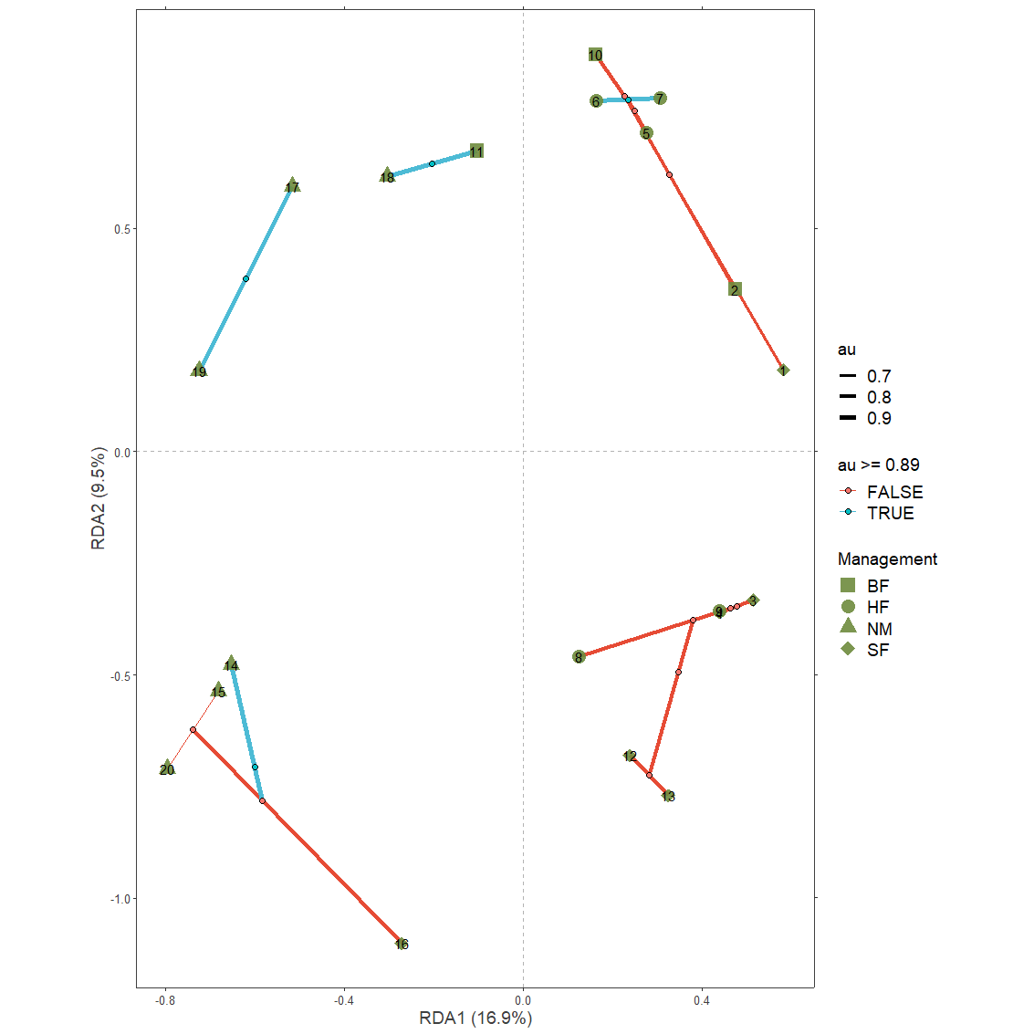 pvlong <- pvclust.long(dune.pv, cl.data1)With a similar methodology as available in ordicluster, higher clustering levels in the hierarchy can be removed via variable prune available from the results for nodes and branches.