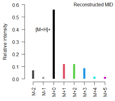 However, in a real world experiment it would be a smart strategy to process non-labeled control samples setting a fixed mid, i.e. c(1, 0, 0, 0) for a molecule with 3 biological carbon atoms like lactic acid, to identify the specific adducts r formed on your device for this molecule. In the next step you can use this information to fix r while processing your labeled samples which will improve the detection of the correct labeling status MID.