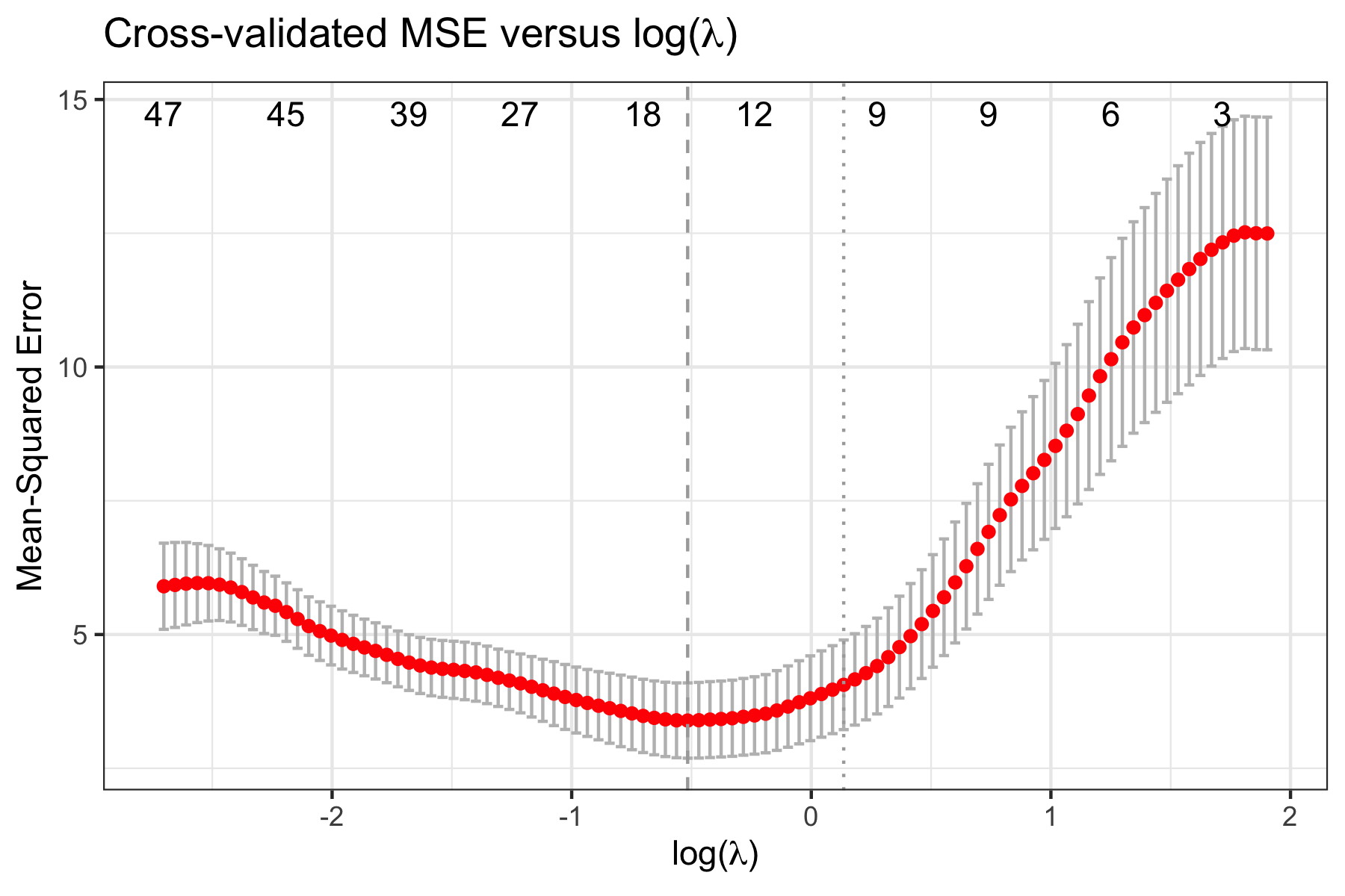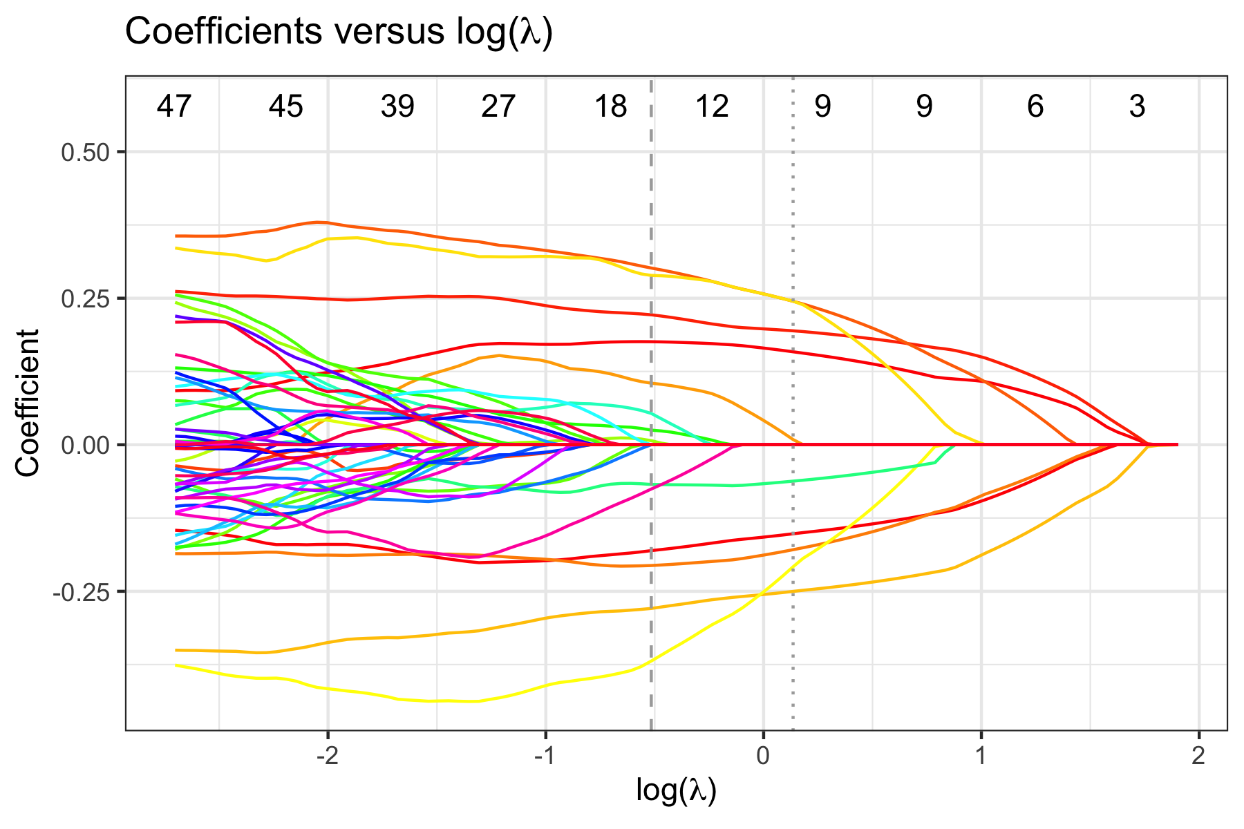 To view selected compositional features, use fit$selected.feature, where features are sorted by their names. Features under min and 1se correspond to penalty parameter \(\lambda_{\min}\) and \(\lambda_{\text{1se}}\), respectively. Features under min.2stage and 1se.2stage are obtained after applying 2-stage filtering based on features under min and 1se, respectively.