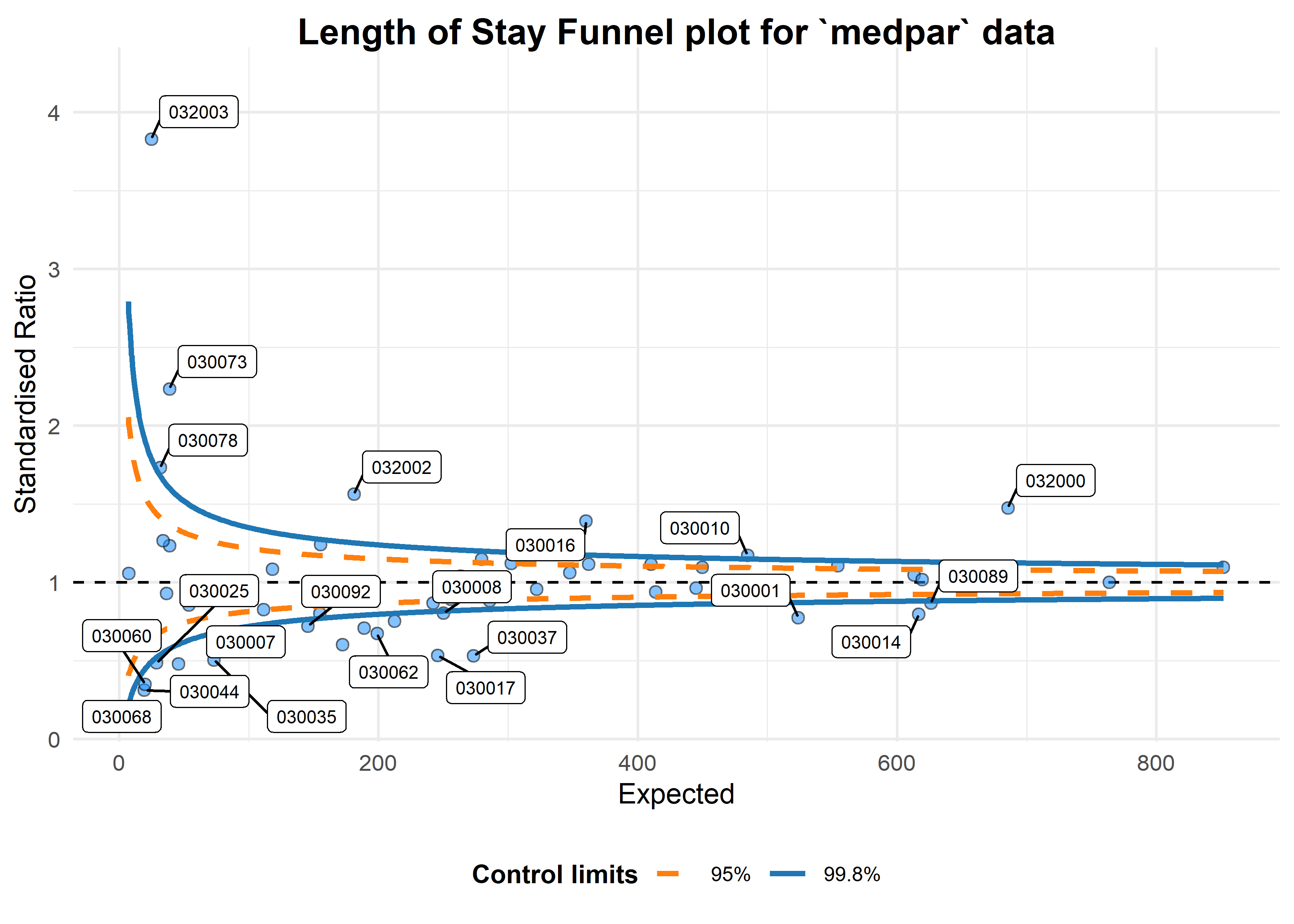 title = 'Length of Stay Funnel plot for `medpar` data', data_type = "SR", limit= 99,