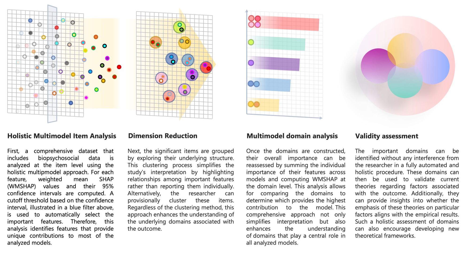Holistic Multimodel Domain Analysis (HMDA) is a new paradigm for exploratory machine learning research, with notable potential applications in mental health and well-being research. Traditional ML analyses typically focus on finding a single “best” model based on performance metrics such as accuracy or the area under the curve (AUC). While this approach can be effective for certain predictive tasks, it can also mask important disagreements among other high-performing models, and overlook the broader, more nuanced associations that might exist in a dataset. In exploratory research, such disagreements are important and should be taken into consideration, rather than making a single-minded inference regarding the “best” model with a negligible performance difference.