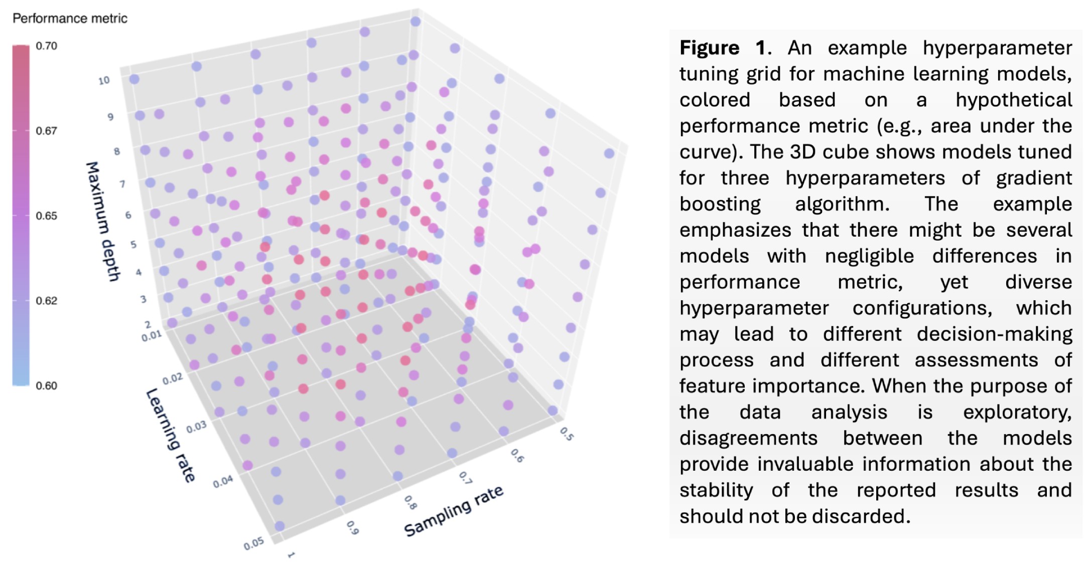 Consider the following 3-dimensional hypertuning space, which trains machine learning models for three hyperparameters. You can see that in such a grid, there will be multiple models with very close performance, yet, very different hyperparameters, which are not necessarily located in the same neighborhood. Diversity of the hyperparameters also hints that the logic of the resulting model can be very different from other models and hence, such models may have different opinions about the importance of features in the training dataset.