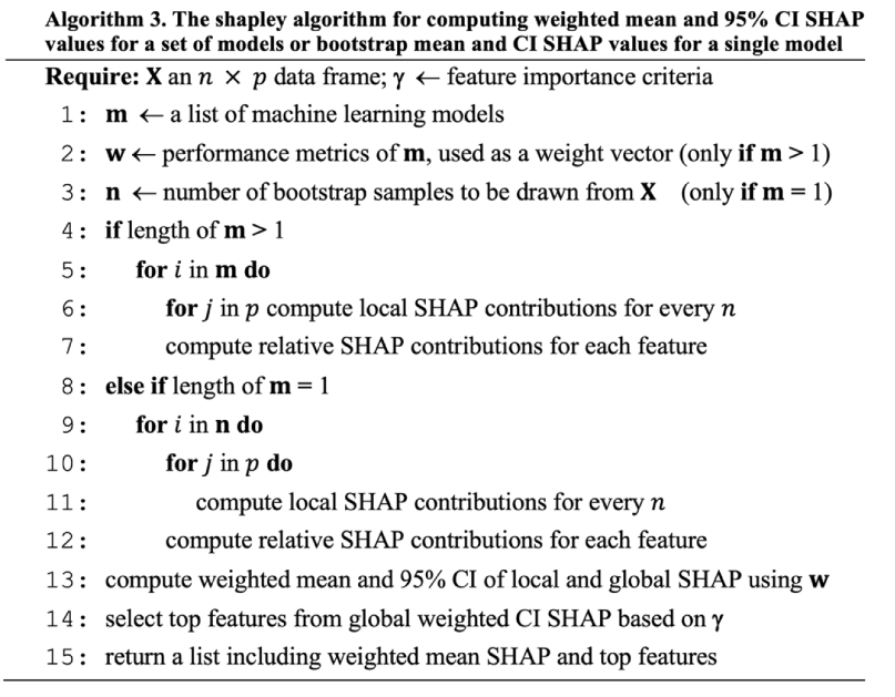 )After training a large set of models, the next step is to compute Weighted Mean SHAP (WMSHAP) values. Suppose we only include models with an AUC > 0.50 (i.e., non-random classification), which is the default. We can calculate ensemble-level feature importance as follows: