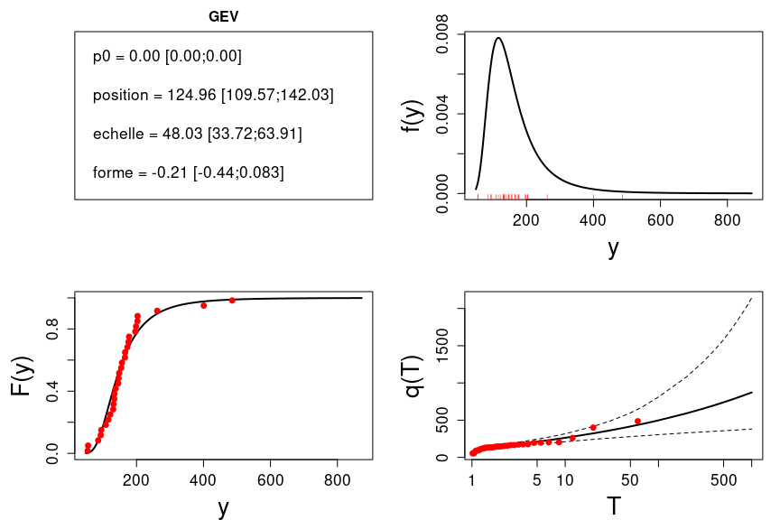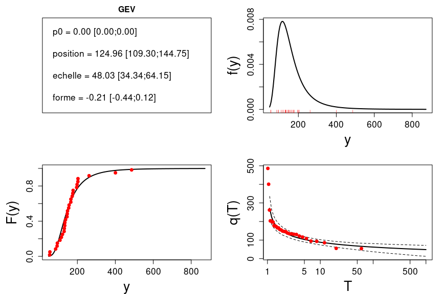 Deux fonctions sont fournies pour une estimation interactive Q=f(T) (quantile pour une période de retour donnée) ou T=f(Q) (période de retour associée à une valeur). Dans les deux cas le résultat inclut un intervalle d’incertitude.