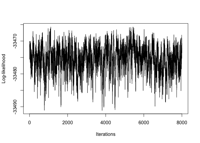 plot(Output1$LLPst, type = 'l', xlab = "Iterations", ylab = "Log-likelihood")