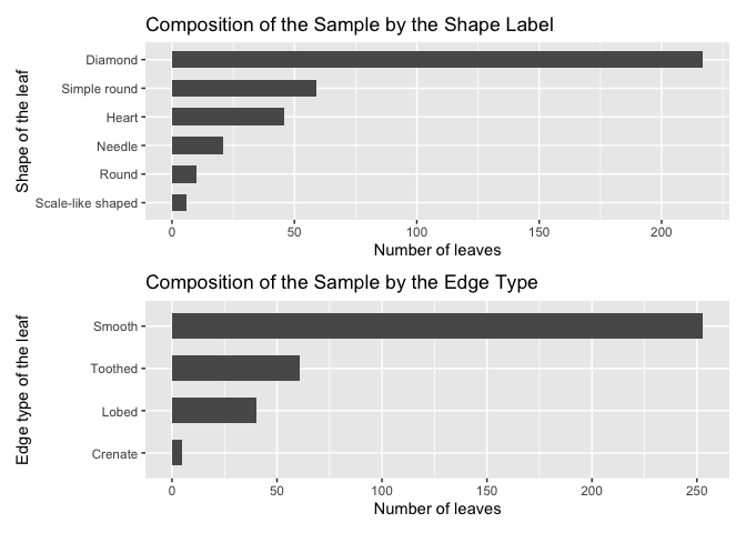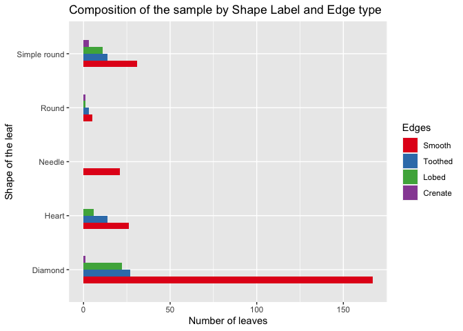 p2 <- ggplot(d11, aes(x= reorder(Shape_of_the_leaf, No_of_leaves), y=No_of_leaves)) + labs(y="Number of leaves", x="Shape of the leaf") + geom_bar(stat = "identity", width = 0.6) + ggtitle("Composition of the Sample by the Shape Label") + coord_flip()d11 <- as.data.frame(table(medlea$Edges))