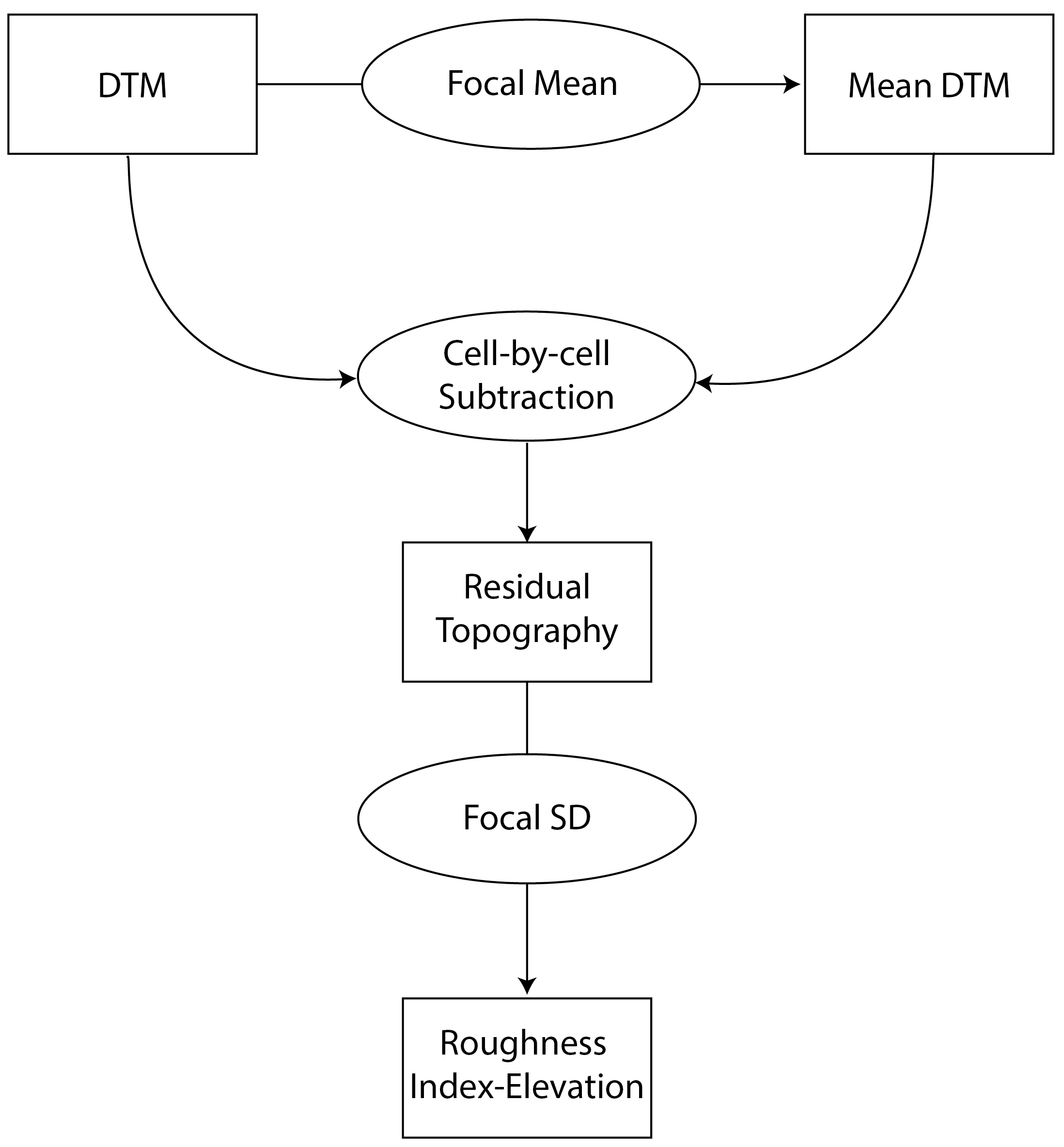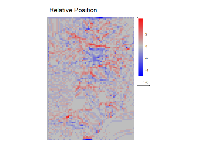 Relative position represents whether an area is a local high or low in relation to a reference height. It is calculated as the value of the focal cell minus the value of a reference elevation which is often the mean of included values in the focal window but could also be other functions such as the median, min, or max of included values. Positive values indicate local topographic highs and negative values indicate lows.Relative Position can be expressed in units of the input DTM raster or can standardized relative to the local topography by dividing by the standard deviation or range of included elevation values in the focal window.