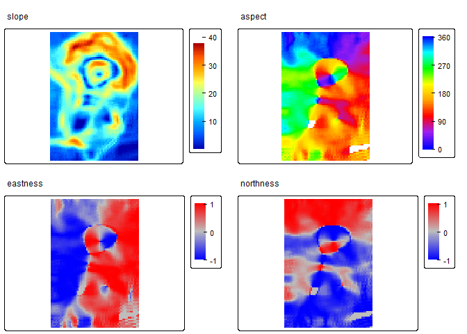 slp_asp<- SlpAsp(r = r, w = c(5,5), unit = "degrees", method = "queen", metrics = c("slope", "aspect", "eastness", "northness"), na.rm=TRUE)
