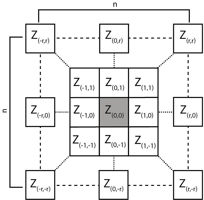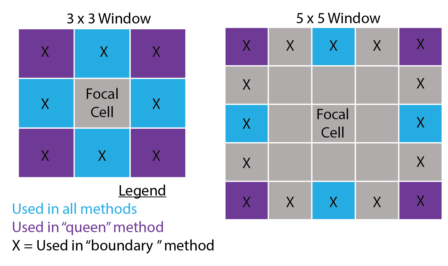 Examples of different focal window shapes. Shown are a 13 x 13 cell rectangular window (left), a circular window with a radius of six cells (center), and an annulus window with an inner radius of four cells and an outer radius of six cells (right).
