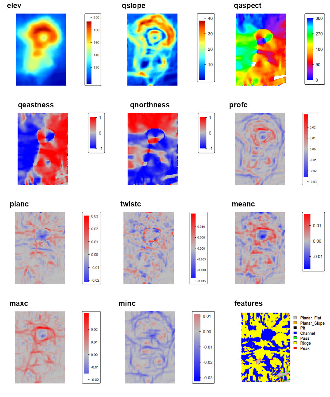 qmetrics<- Qfit(r, w = c(5,5), unit = "degrees", metrics = c("elev", "qslope", "qaspect", "qeastness", "qnorthness", "profc", "planc", "twistc", "meanc", "maxc", "minc", "features"), na.rm = TRUE)