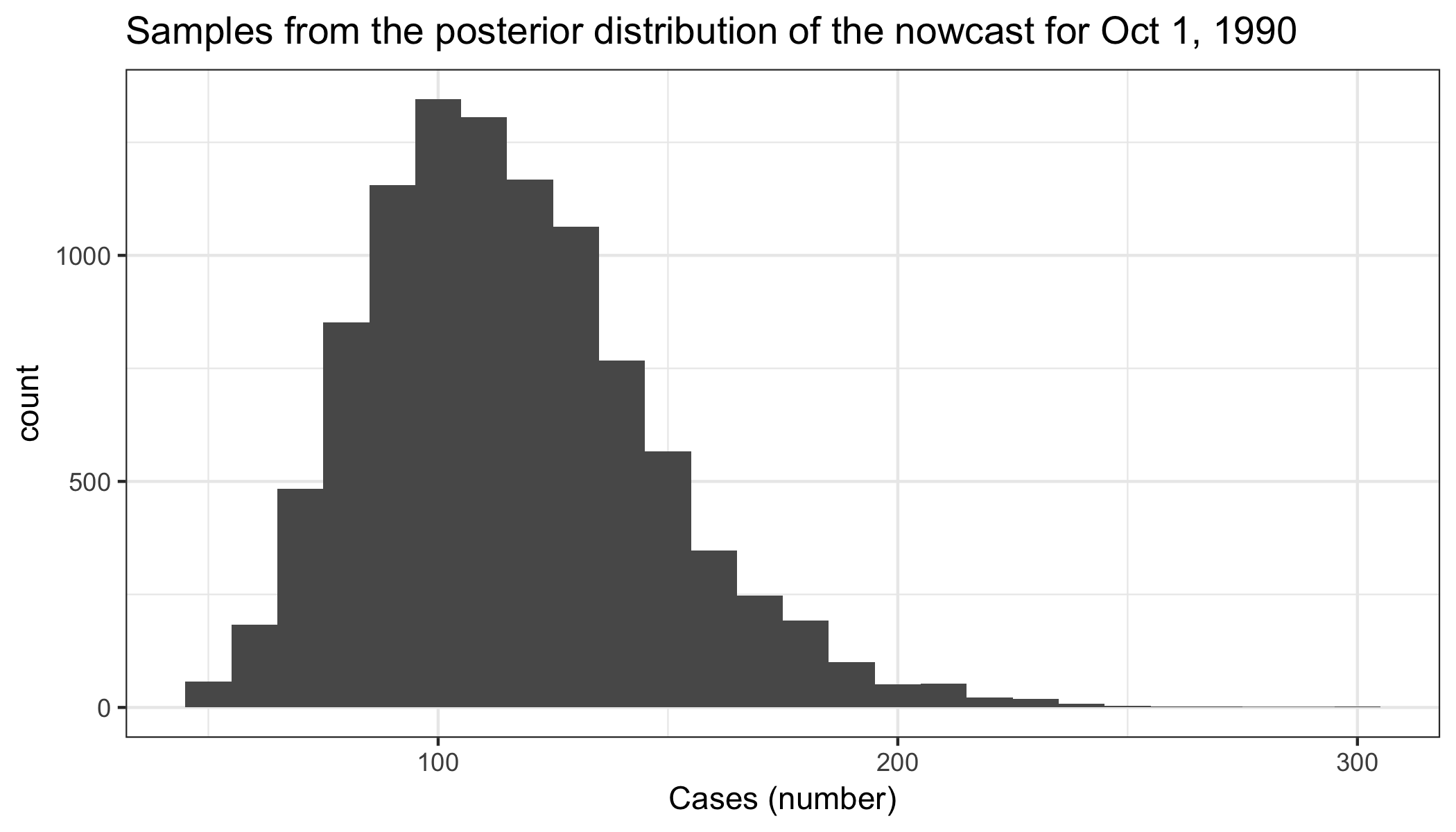 ggtitle("Samples from the posterior distribution of the nowcast for Oct 1, 1990")
