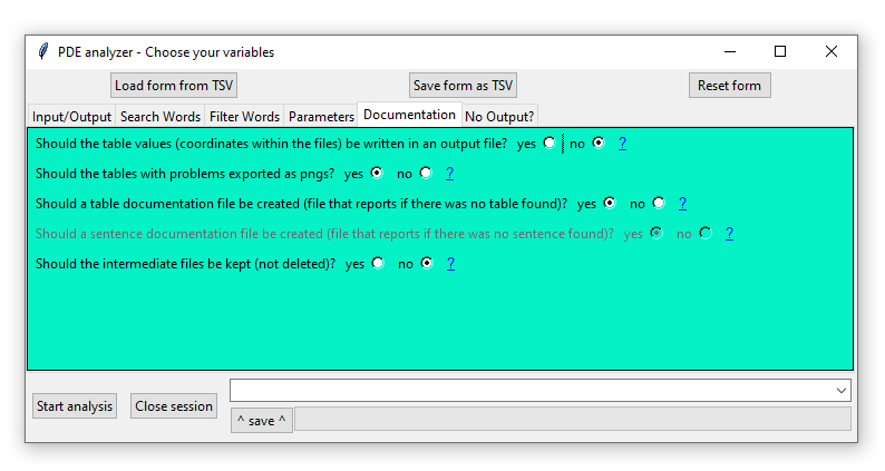 1. Choose what to extract: The PDE analyzer has 2 main functions A] PDF2TXT (extract sentences from pdf) and B] PDF2TABLE (table of PDF to excel file) which can be combined or executed separately. Each function can be combined with filters and search words. A file with the sentences carrying the search words will have the name format: [search words]txt+-[context][PDF file name] in the corresponding subfolder. Tables will be named: [PDF file name][number of table][table heading].