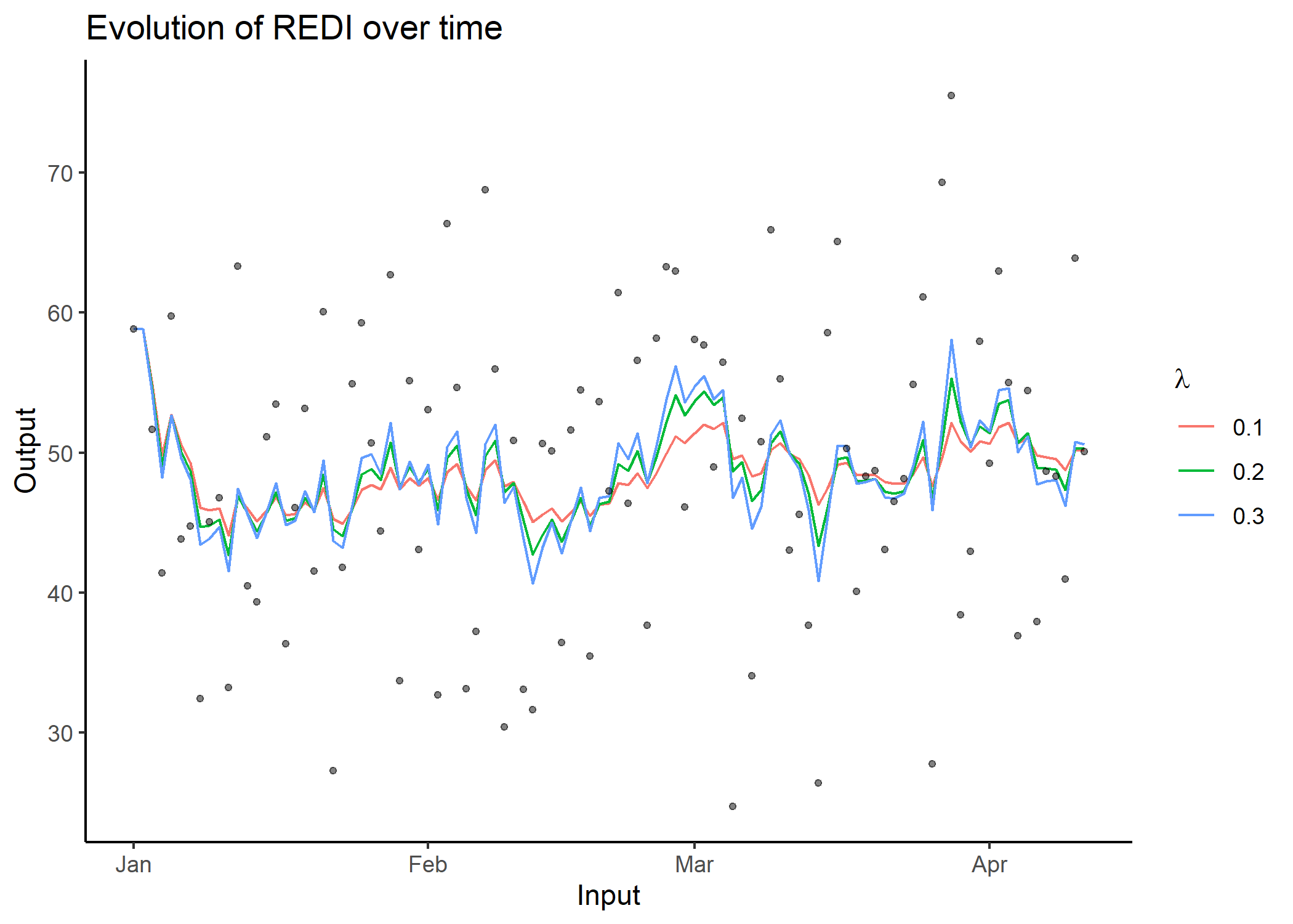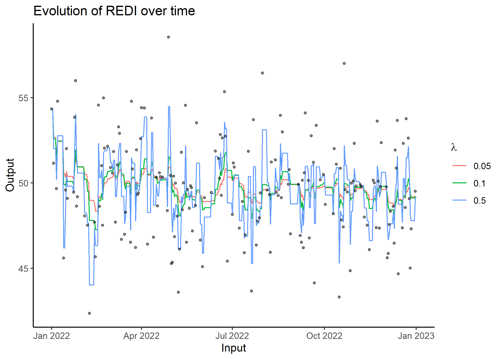 To compute a single REDI value, simply use the compute_redi() function. It will correspond to the REDI value for the most recent observed Input in the dataset, using all data from the past. Feel free to adapt the \(\lambda\) coefficient, controlling the exponential decay of weights over time, depending on the context.