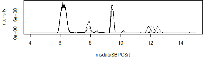 Base peak chromatograms (BPCs) and total ion chromatograms (TICs) have three columns, making them super-simple to plot with either base R or the popular ggplot2 library: