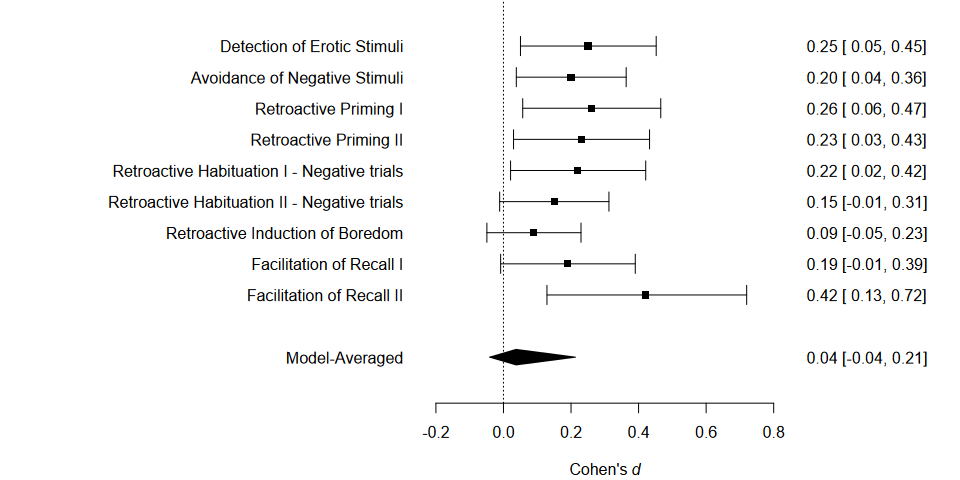 devtools::install_github("FBartos/RoBMA")To illustrate the functionality of the package, we fit the RoBMA-PSMA model from the example in Bartoš, Maier, et al. (2023) to adjust for publication bias in the infamous Bem (2011) “Feeling the future” pre-cognition study. The RoBMA-PSMA model combines six selection models and PET-PEESE to adjust for publication bias. As in the pre-print, we analyze the data as described by Bem et al. (2011) in his reply to methodological critiques.