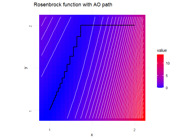 rosenbrock <- function(x) (1 - x[1])^2 + (x[2] - x[1]^2)^2The resulting optimization path …