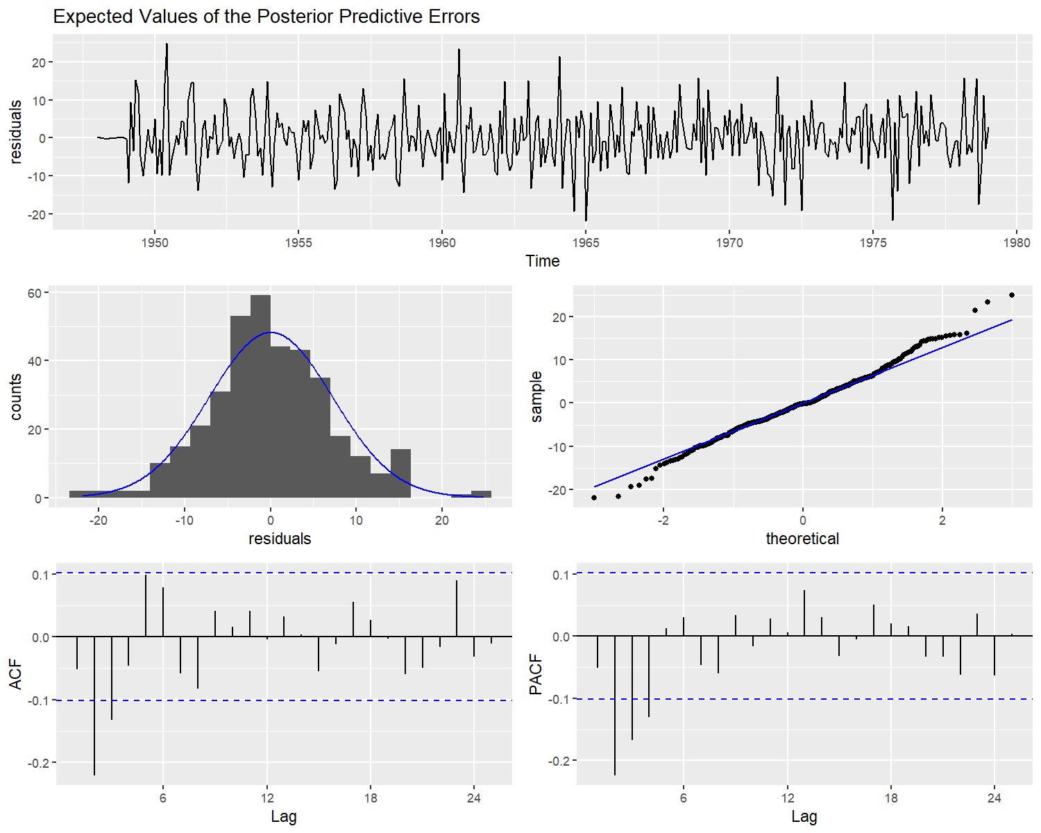 #> scale reduction factor on split chains (at convergence, Rhat = 1).After fitting our model we can make a visual diagnostic of our parameters, check residuals and fitted values using the plot method. The package provides the posterior sample of every residual, but checking all of them is an exhausting task. An alternative, is checking the process generated by the residuals posterior estimate.