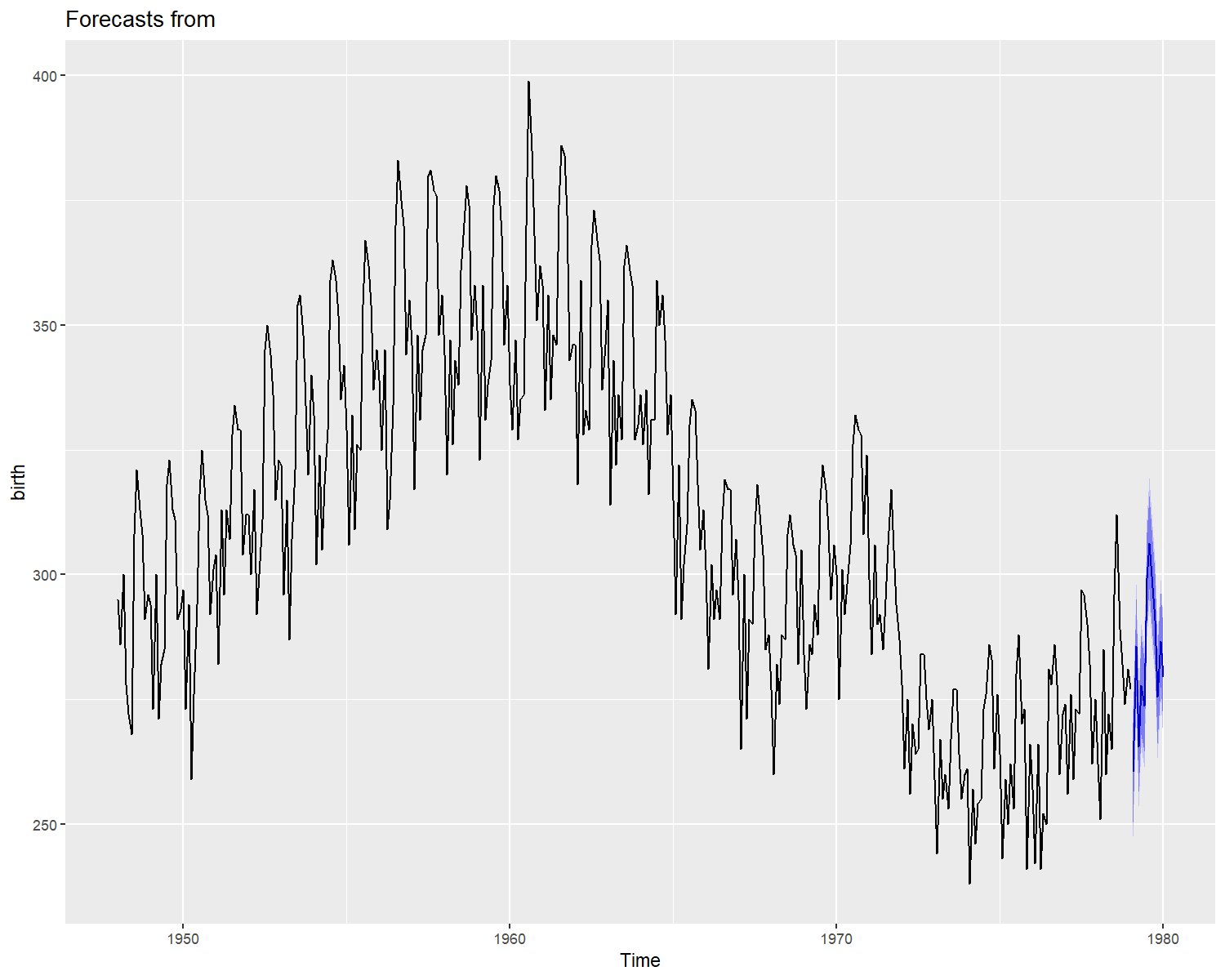 A white noise behavior indicates a good model fit. The model’s residuals in figure 2, seems to follow a random noise, the auto-correlation in acf plots quickly falls to zero, indicating an acceptable model fit. Finally a forecast of the for the next year can be performed as: