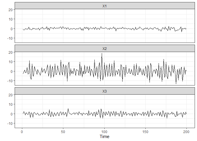 Xsim <- simVAR(periods+burnin+1, k, p, max_abs_eigval = 0.8, seed = 123)