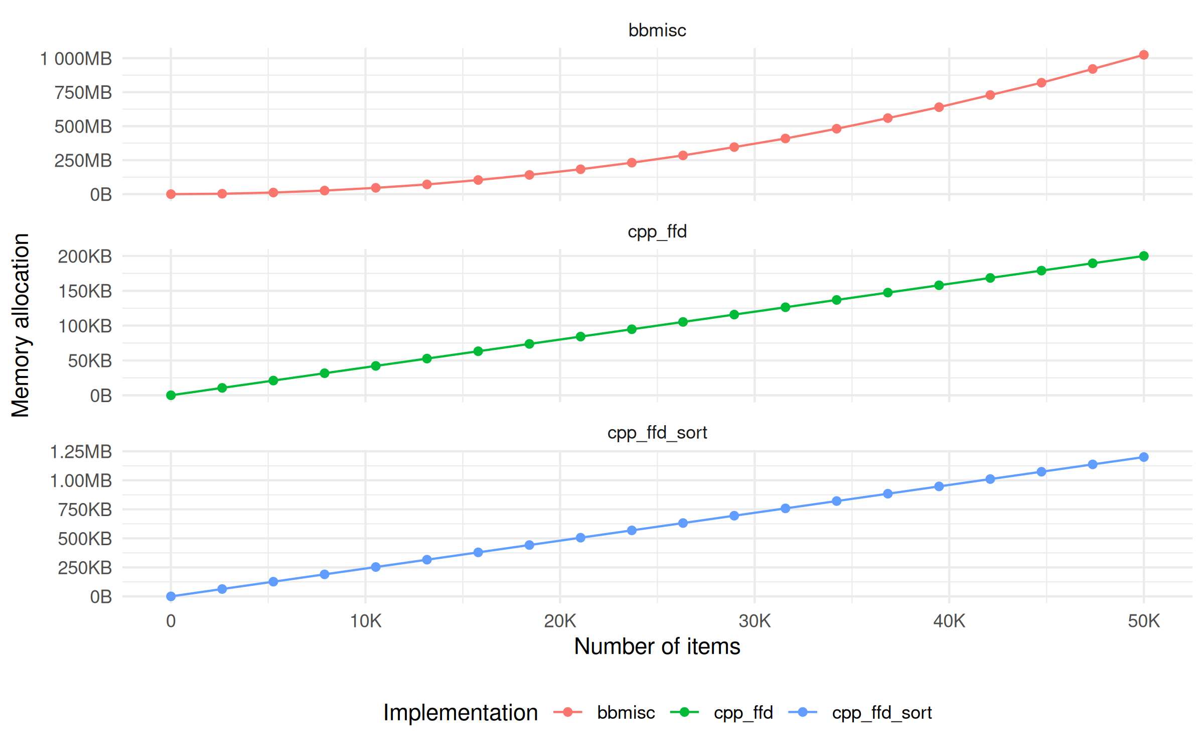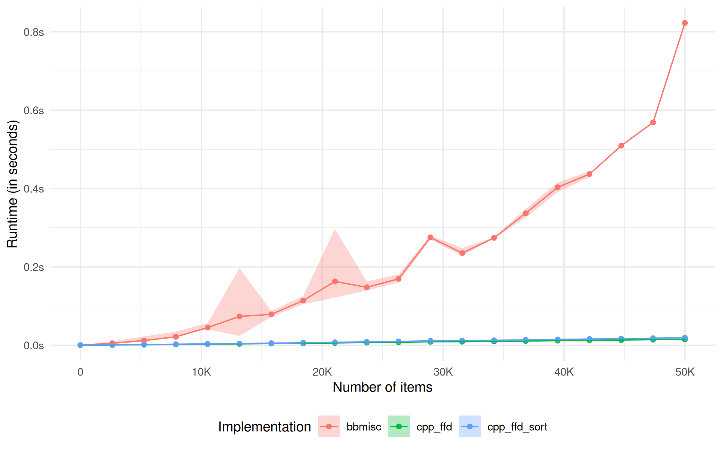 #> [1] 389The implementation in this package is compared to an implementation of the same algorithm in the BBmisc package. The authors made it clear that speed was none of their concern. BBmisc’s implementation is written in R while this package uses a C++ implementation.