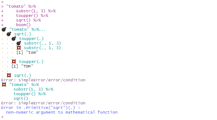 The {boomer} package provides debugging tools that let you inspect the intermediate results of a call. The output looks as if we explode a call into its parts hence the name.