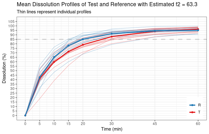 2. calcf2() to calculate similarity factor f2 according to different regulatory rules. See vignette Calculating Similarity Factor f2 on CRAN for details.