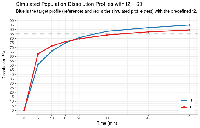 3. sim.dp.byf2() to find a dissolution profile that, when compared to a given reference profile, has f2 value equal to the predefined target f2. See vignette Simulation of Dissolution Profiles with Predefined Target f2 on CRAN for details.