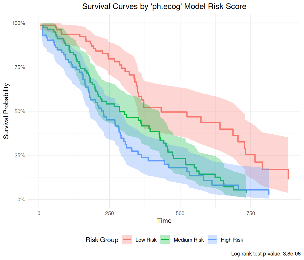 title = "Survival Curves by 'ph.ecog' Model Risk Score"