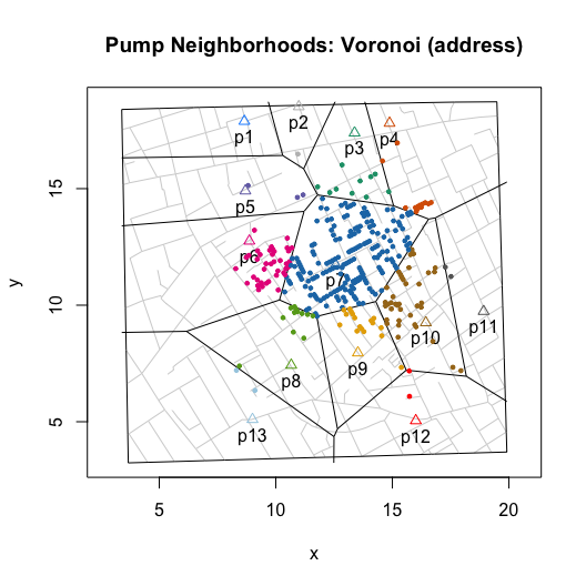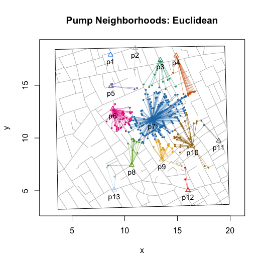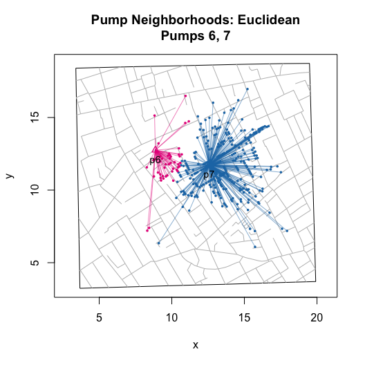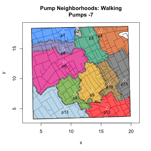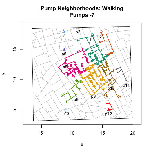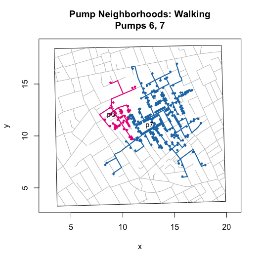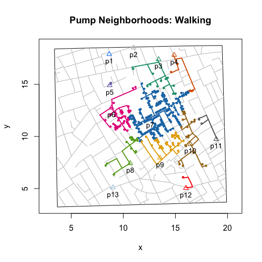 I then wrote functions that compute and visualize walking distances on the map. The value of these functions go beyond the ability to replicate and validate Snow’s efforts. By allowing you to compute hypothetical neighborhoods via selective inclusion or exclusion of pumps or to allow for different measures of proximity (e.g., Euclidean), they also allow you to explore counterfactual scenarios. Ultimately, this can help us to better assess whether we really can use the map to “prove” Snow’s claims.