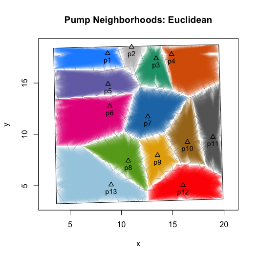 For Euclidean distance based neighborhoods, we can use the same simulated data and compute the as-the-crow-flies distance to the nearest pump. Or, we can leverage a more computationally efficient approach, Voronoi tessellation, which will produce the same neighborhoods.