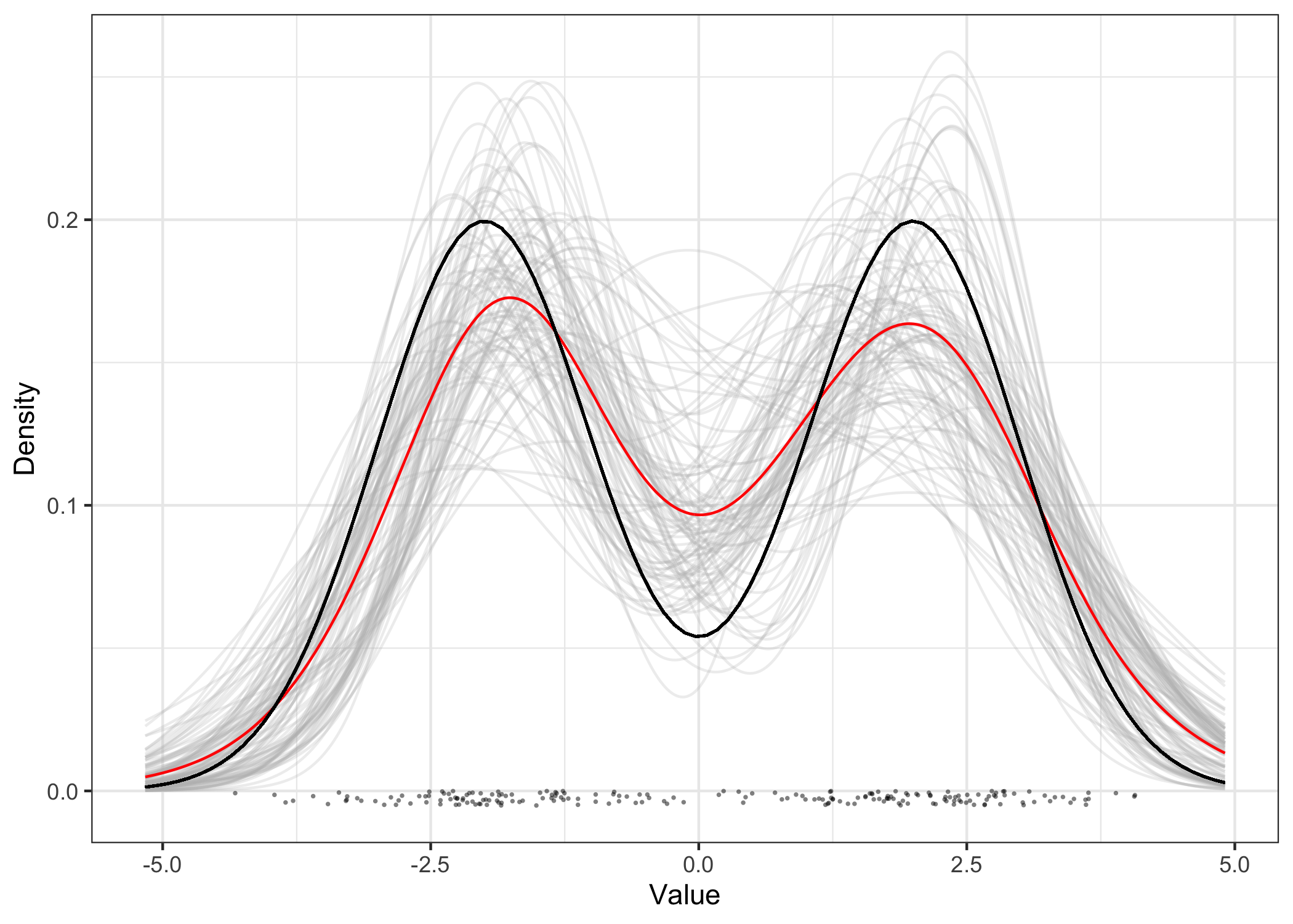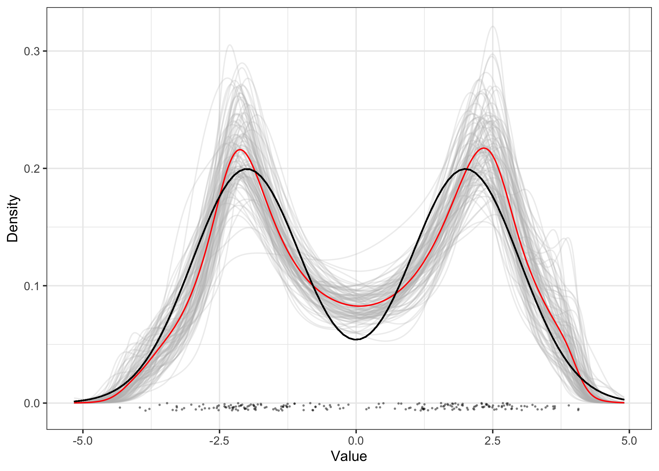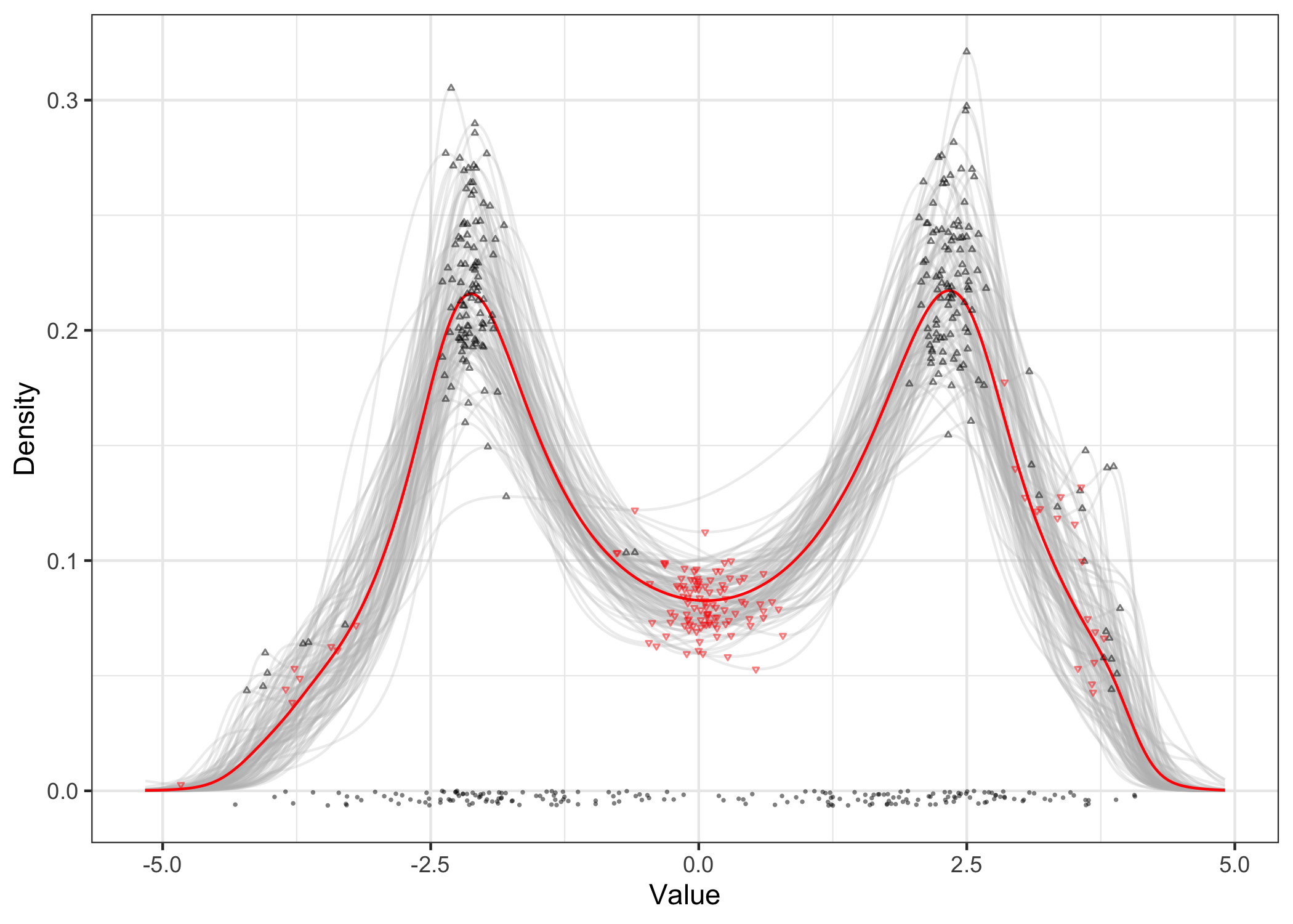 The function modes can be used to isolate local maxima and minima in the density estimates. Here we can see the detected modes in black and the antimodes in red. Experiment with using sample antimodes as a distribution over cluster boundaries!