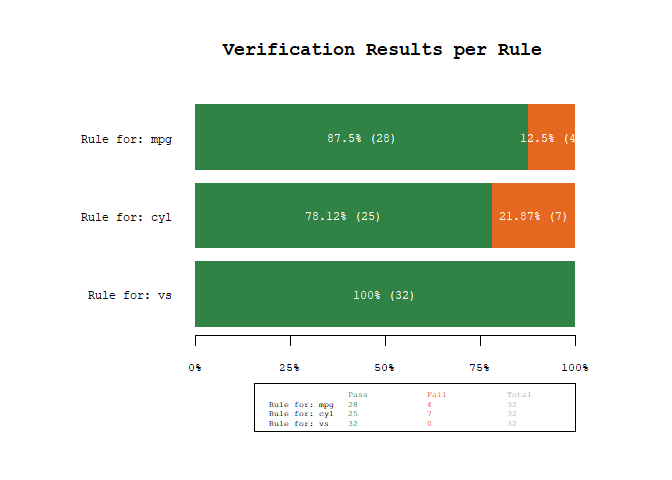 #> 3: Rule for: vs vs %in% c(0, 1) TRUE FALSE 32 32 0 0.0004439354 secsAs we can see, our dataset mtcars does not conform to