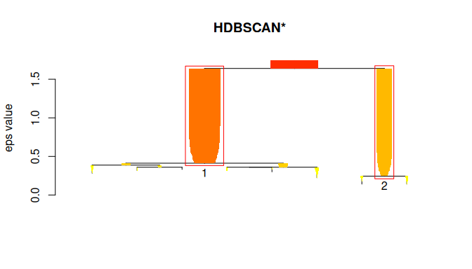 Visualize the hierarchical clustering as a simplified tree. HDBSCAN finds 2 stable clusters.
