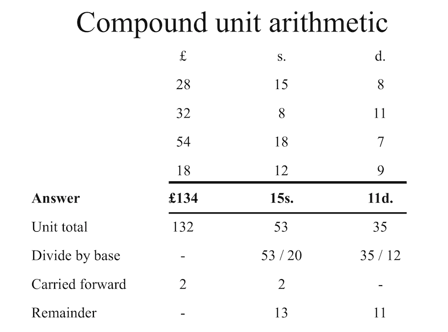non-decimal currency. Doing calculations by hand requires the use of compound
