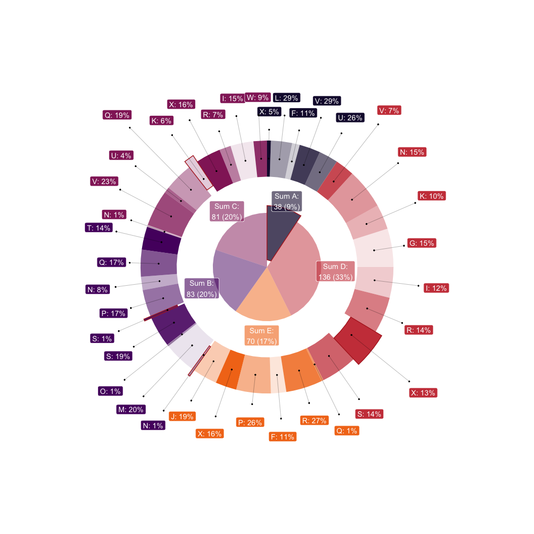 The Donutsk package allows you to build donut/pie charts with ggplot2 layer by layer, exploiting the advantages of polar symmetry. The package is designed to address the limitations of pie charts, which are well-known, while also capitalizing on their ability to effectively represent hierarchical data structures. The following features are worth to be highlighted: