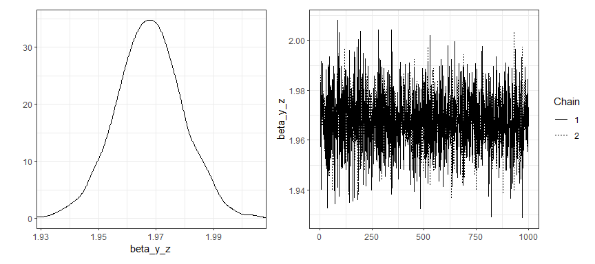 #> 1 beta_y_z 1.97 1.97 0.0116 0.0112 1.95 1.99 1.00 2815. 1434.