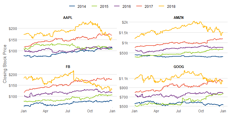 line_plot(gafa_stock, "Date", c("Closing Stock Price" = "Close"),