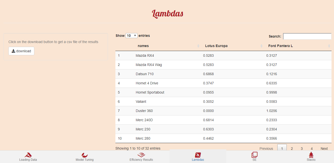 In the Lambdas tab, you get the contribution of the peers to the inefficient units’ score.