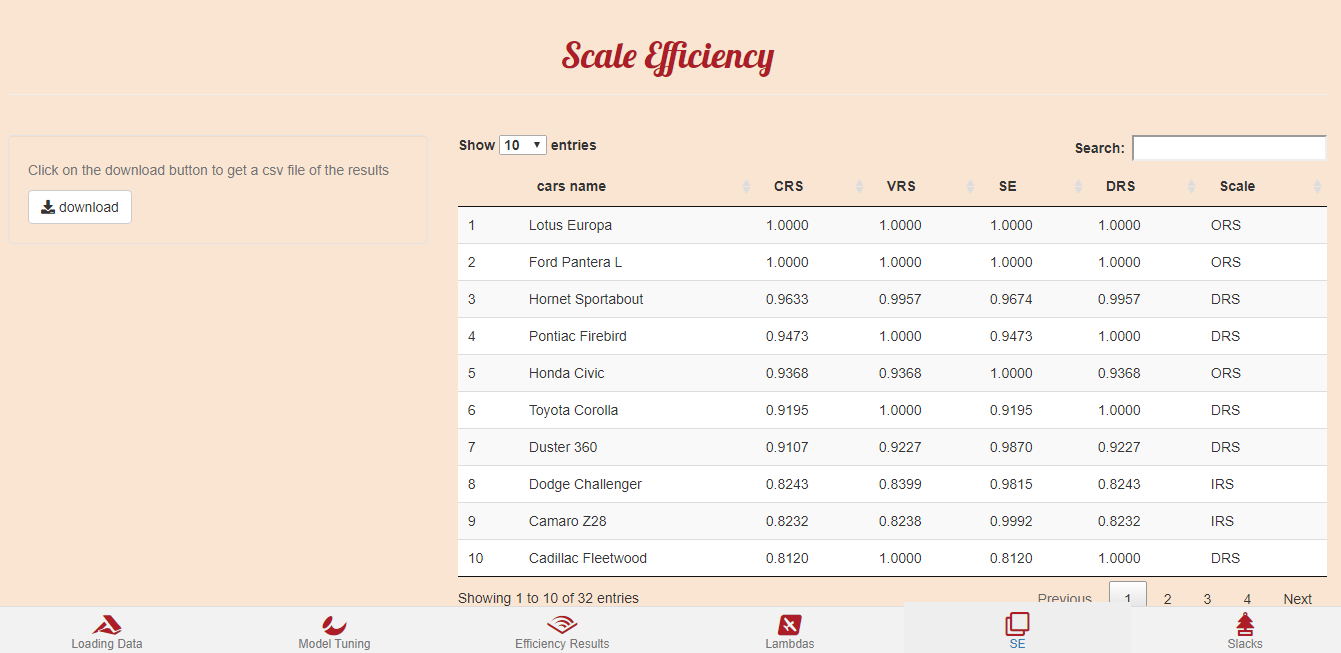 The Efficiency Results tab displays the efficiency scores along with the peers for each unit in a descending order. You have the ability to download the result in a csv format. The tab also provides a summary of the distribution of the efficiency scores.