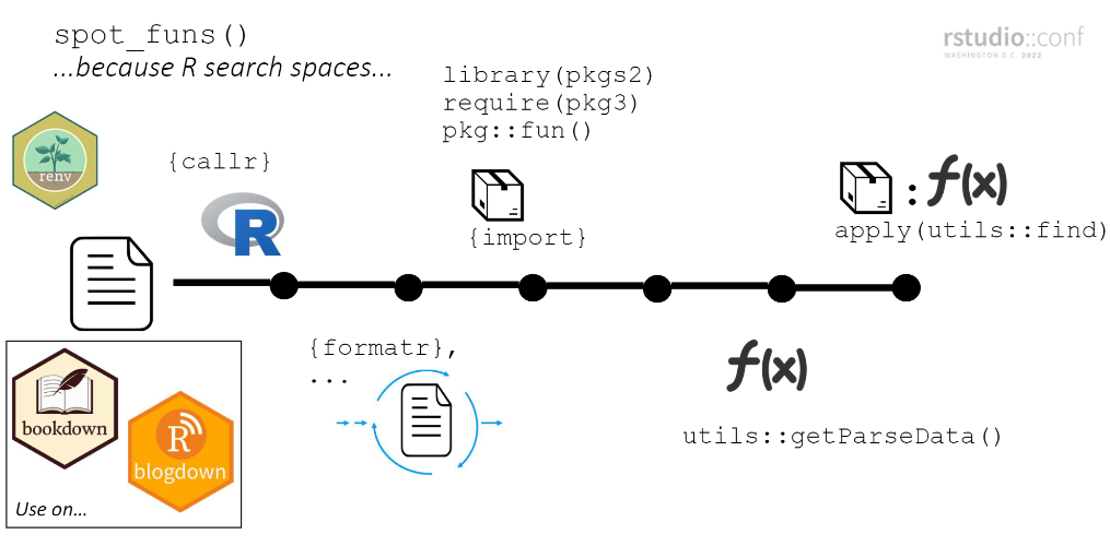 Rather than, for example, targets workflows. Also, in some cases funspotr may not identify every function and/or package in a file (see Limitations, problems, musings or read the source code for details).↩︎