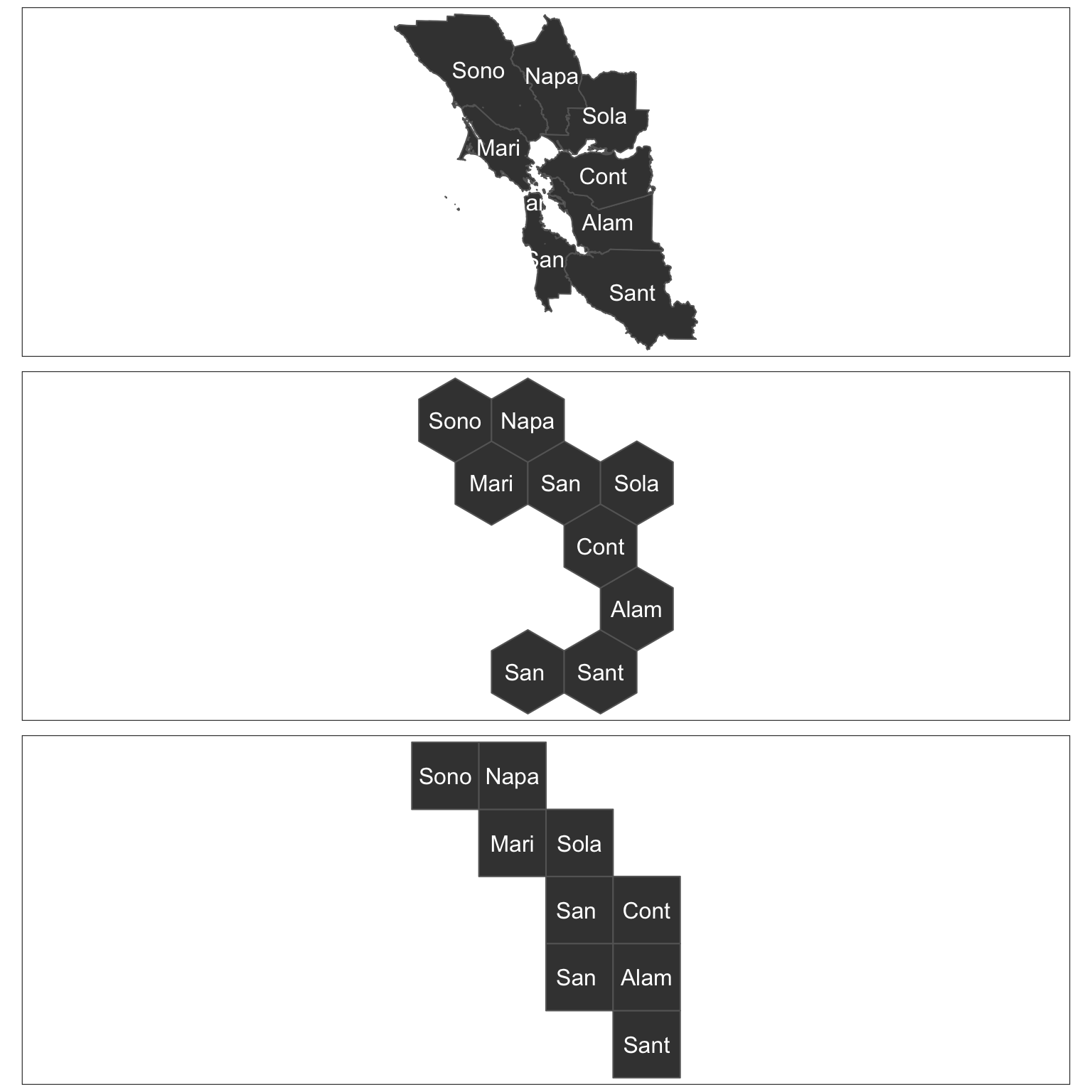 Recent functionality for representing US states, European countries and World countries in a grid has been made available for ggplot2 here and there are many other great examples of hand-specified or bespoke grids. The challenge with this is that if you have a less commonly used geography then it might be hard to find a hand-specified or bespoke grid for your area of interest.