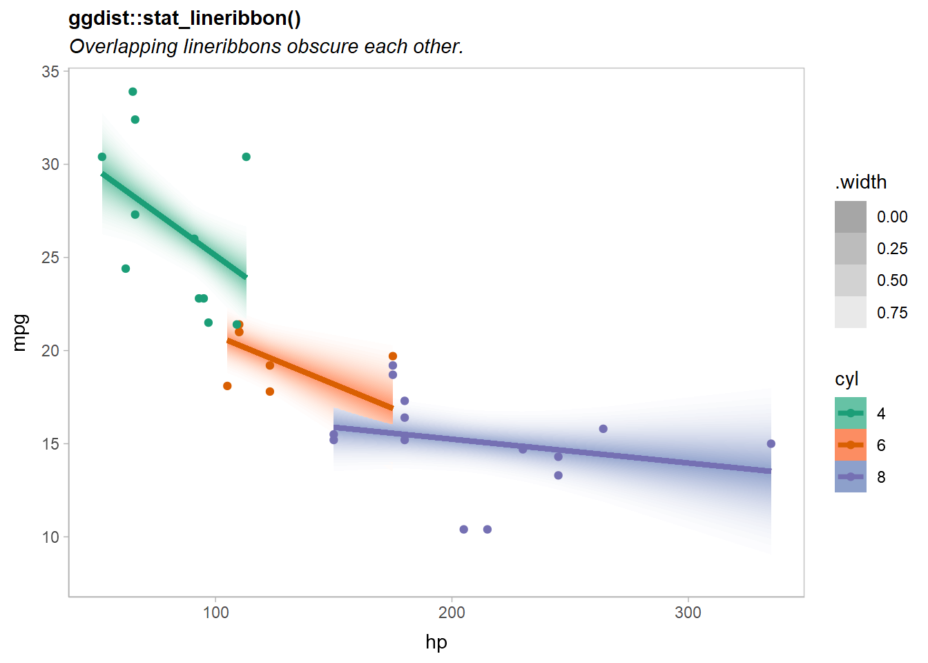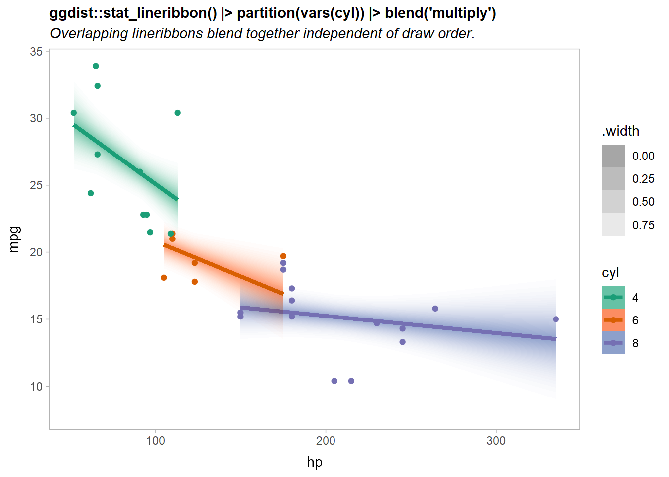 title = "ggdist::stat_lineribbon() |> partition(vars(cyl)) |> blend('multiply')",