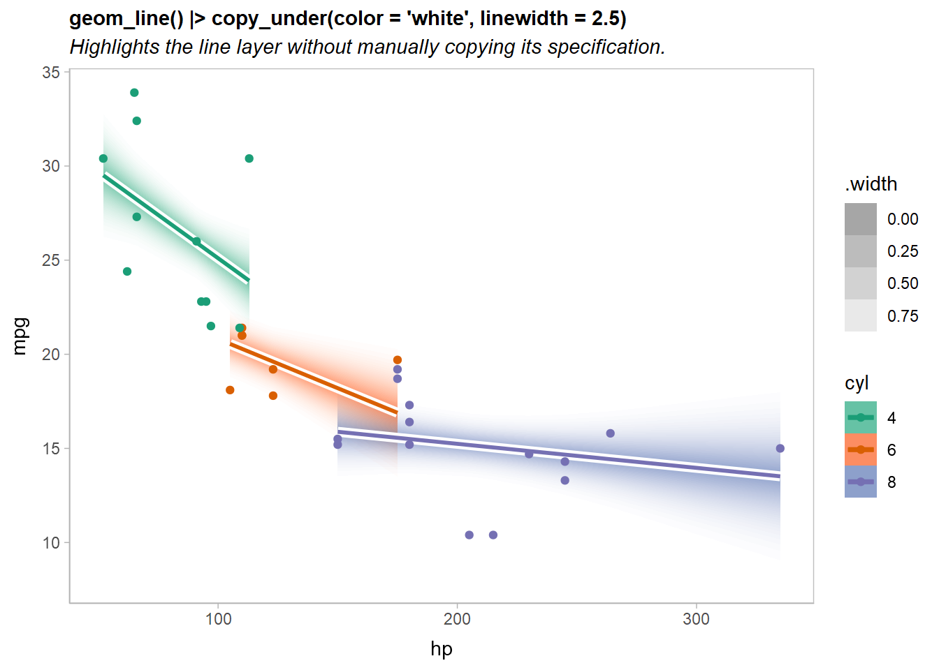 geom_line(linewidth = 1) * copy_under(color = "white", linewidth = 2.5)Here’s an example highlighting the fit lines from our previous lineribbon example: