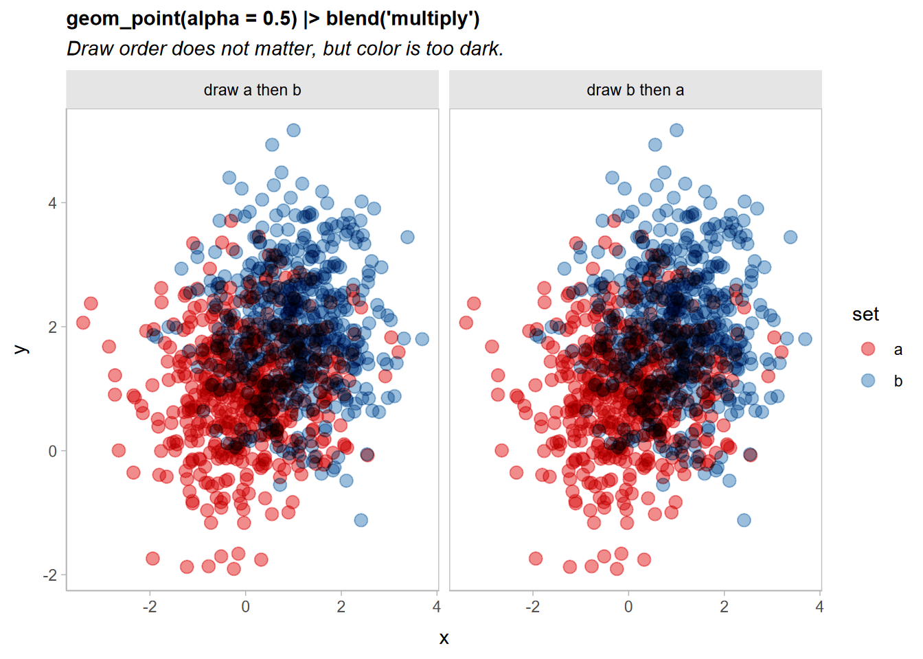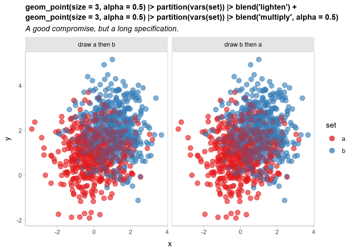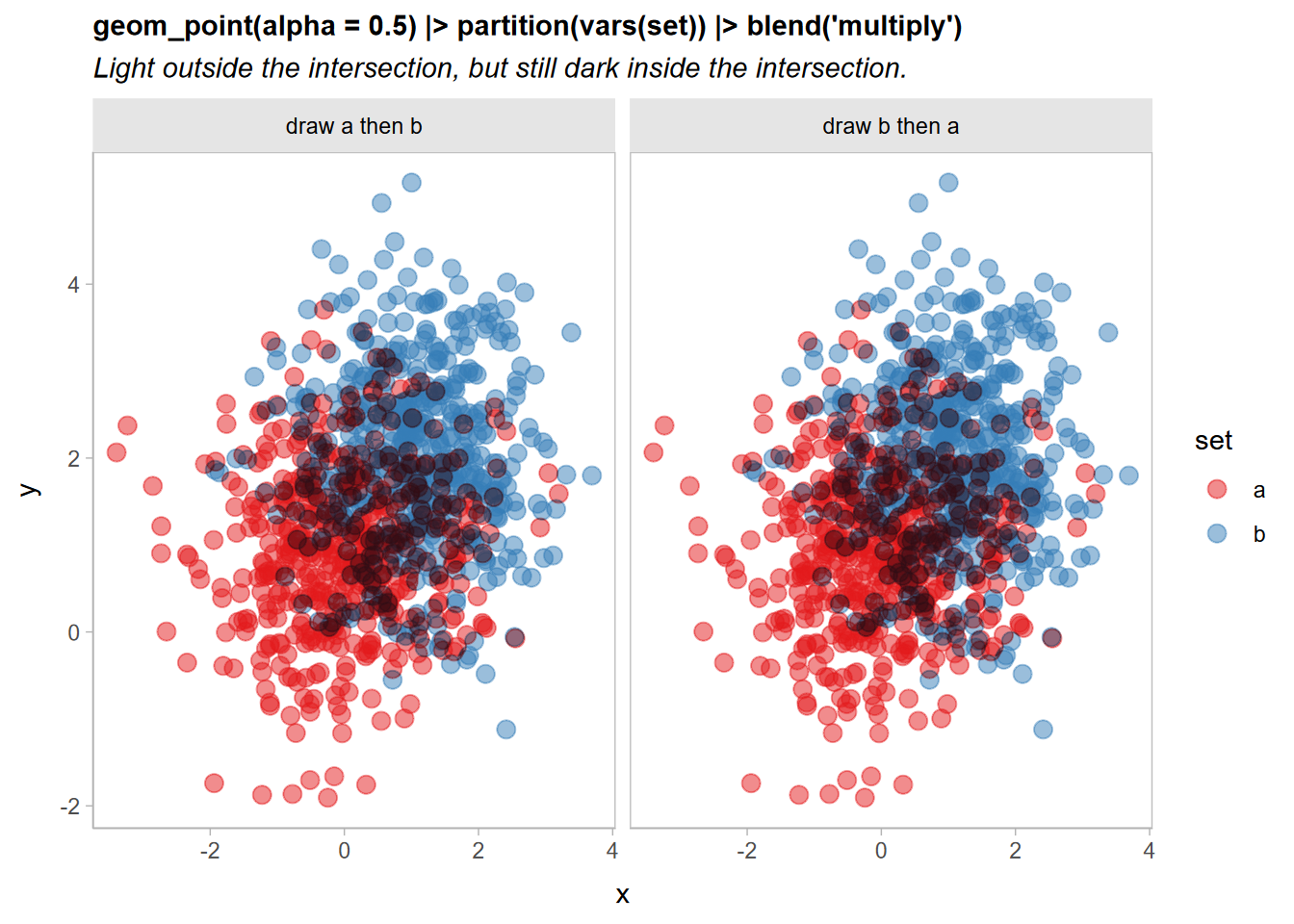 geom_point(size = 3, alpha = 0.5) |> partition(vars(set)) * blend("multiply", alpha = 0.5) +We can simplify this is two ways: first,