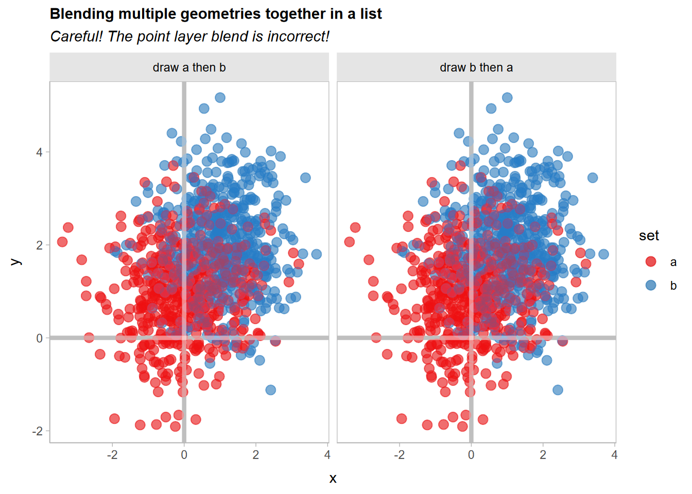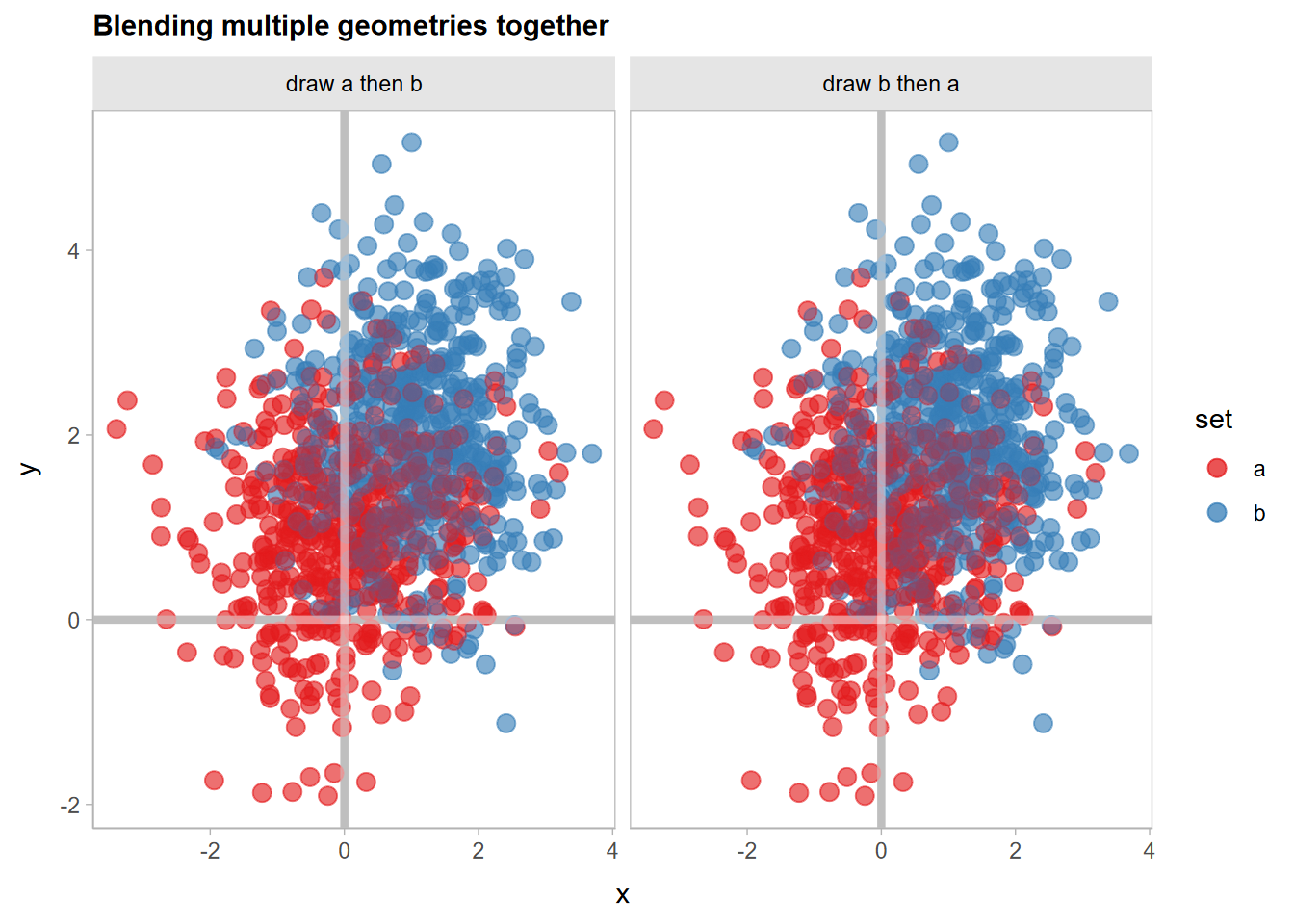 "geom_point(size = 3, alpha = 0.5) |> partition(vars(set)) |> blend('lighten') + \ngeom_point(size = 3, alpha = 0.5) |> partition(vars(set)) |> blend('multiply', alpha = 0.5)",