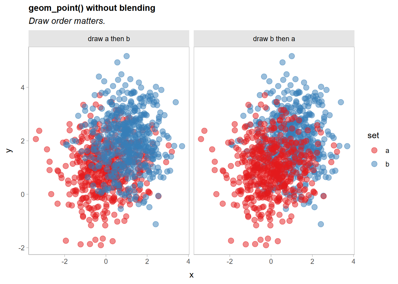 labs(title = "geom_point() without blending", subtitle = "Draw order matters.")