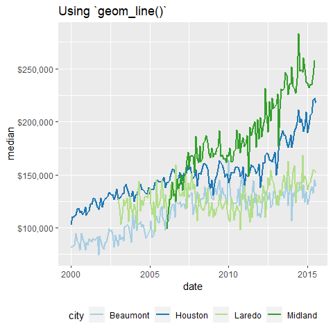 p + geom_line(linewidth = 1) + ggtitle("Using `geom_line()`")