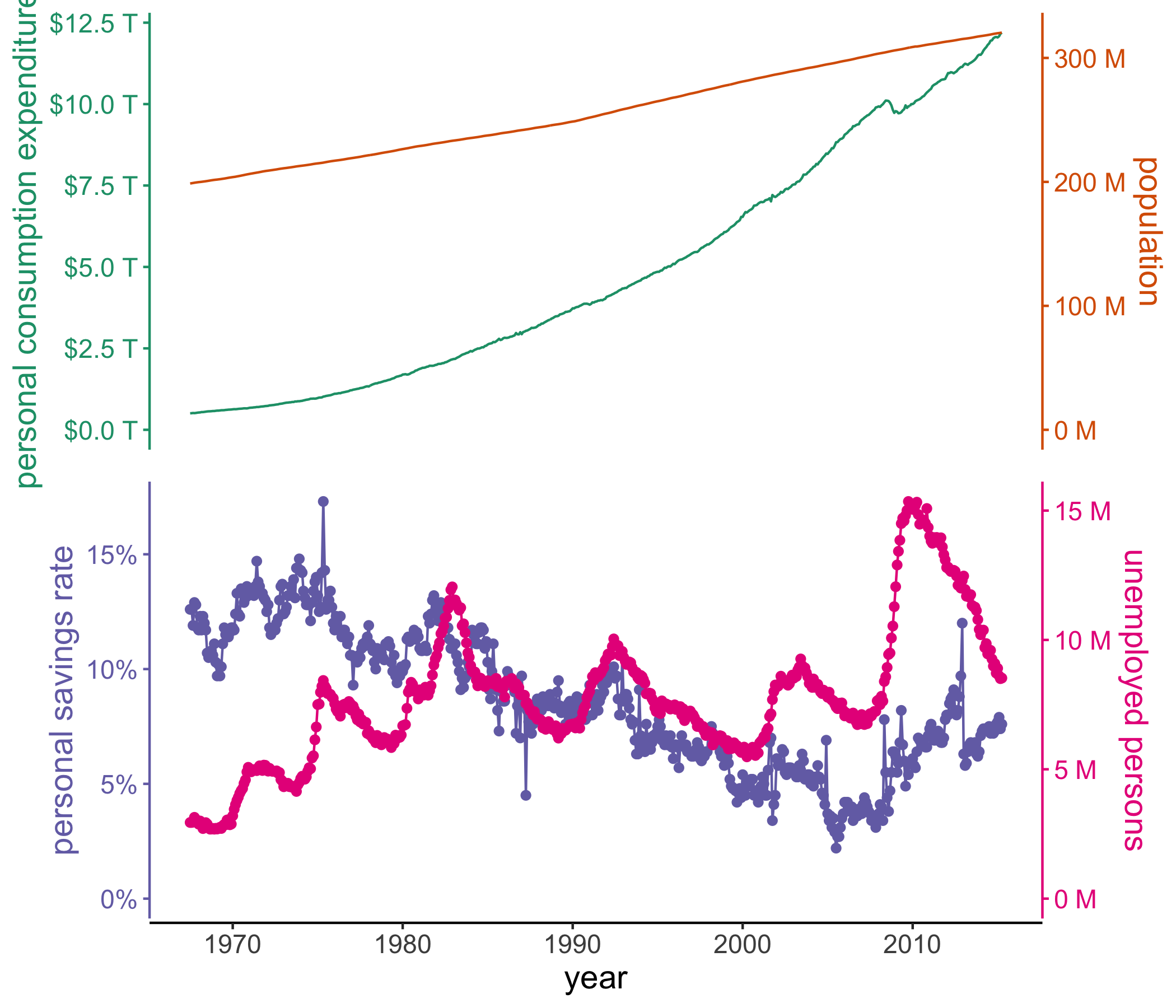 # using the built-in economics dataset in ggplot2 to create a vertical stack