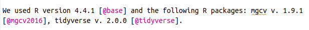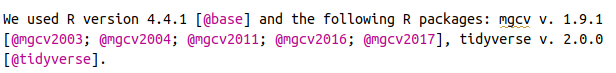 text.pkgs = "und die folgenden R-Pakete")"Wir verwendeten die R version 4.5.1 [@base] und die folgenden R-Pakete: badger v. 0.2.5 [@badger], desc v. 1.4.3 [@desc], knitr v. 1.50 [@knitr2014; @knitr2015; @knitr2025], mgcv v. 1.9.3 [@mgcv2003; @mgcv2004; @mgcv2011; @mgcv2016; @mgcv2017], pkgdown v. 2.1.3 [@pkgdown], remotes v. 2.5.0 [@remotes], renv v. 1.1.5 [@renv], rmarkdown v. 2.29 [@rmarkdown2018; @rmarkdown2020; @rmarkdown2024], testthat v. 3.2.3 [@testthat], tidyverse v. 2.0.0 [@tidyverse], visreg v. 2.7.0 [@visreg]."